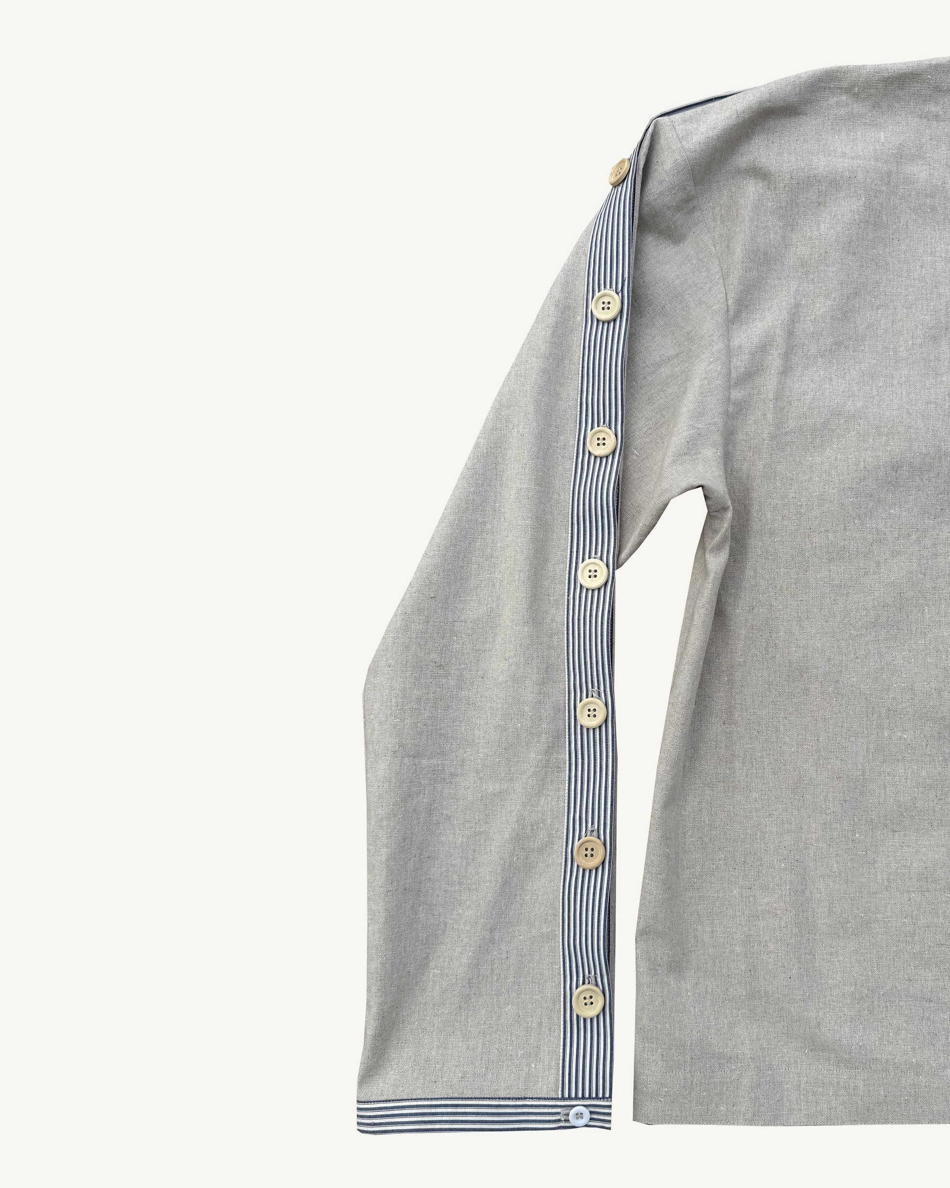 - extended button placket that spans from one shoulder seam, across the neckline, down to the wrist of the opposing arm