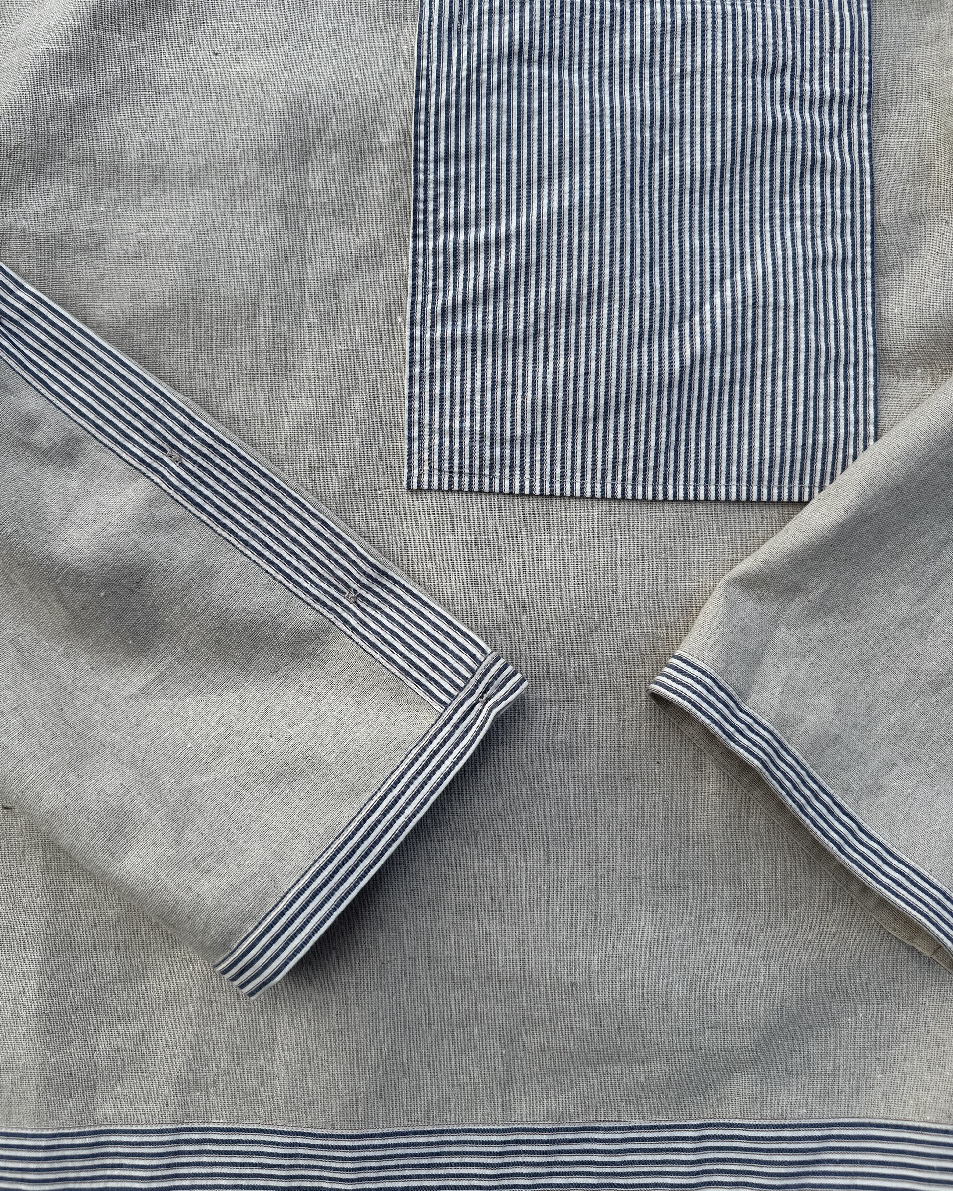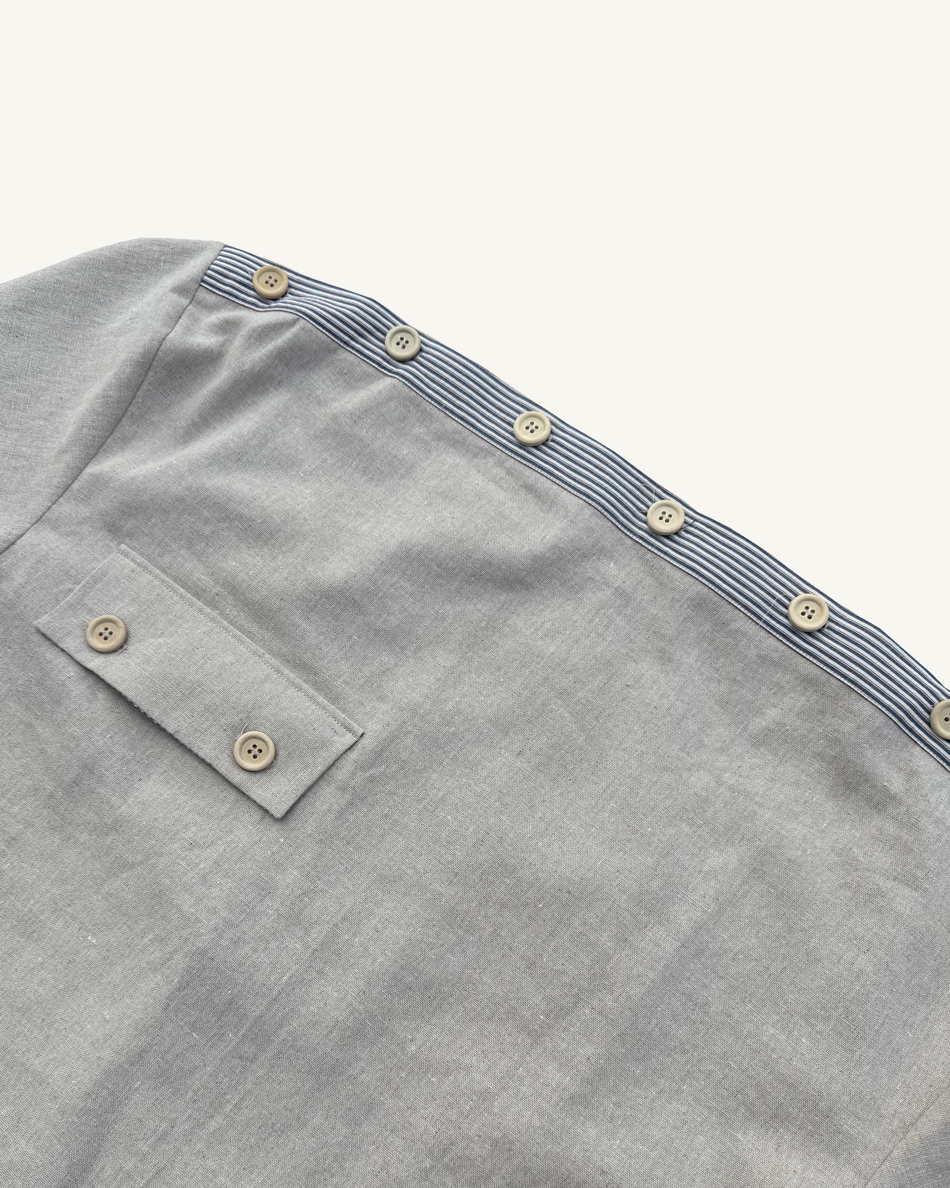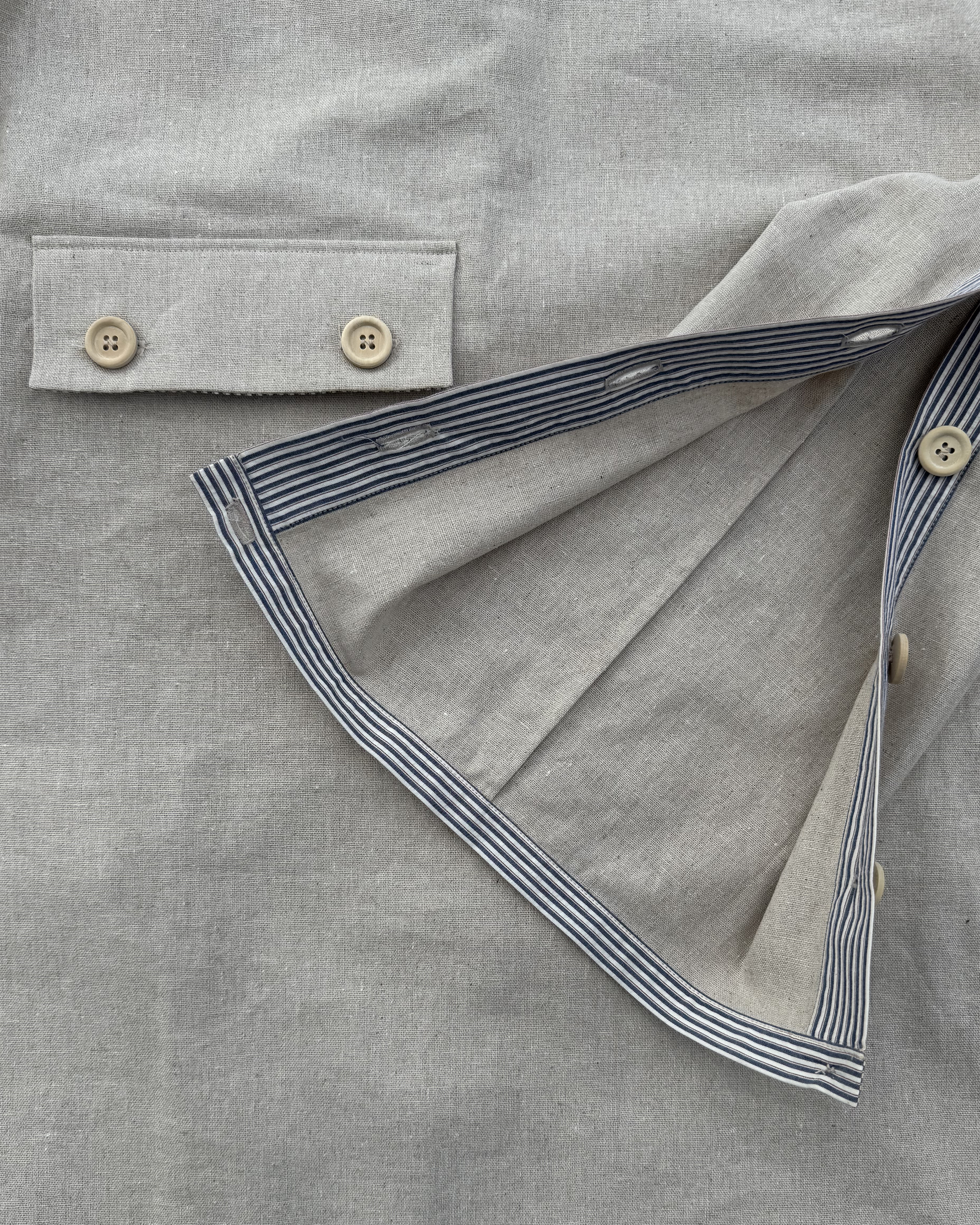 This resulted in a slouchier fit pullover with wider shoulders that almost looks “poncho-esque” when worn on body. This is primarily achieved through pattern adjustments to the sleeve intersection. As pictured, this piece was made with a “J” cut sleeve that mirrors the Dual Mule Trousers and provides ample room from the elbow up to the shoulder. The central design detail of this piece is an extended button placket that spans from one shoulder seam, across the neckline, down to the wrist of the opposing arm. This results in a unique look and an increased level of modularity at the arm and neck. The buttons can be snapped tight to create a more standard fit or undone to create a relaxed slash neck look. This piece also features a chest pocket with wood buttons that complement the collar. Fabric was meticulously chosen to most accurately reflect the natural look and feel of the rolling hills of the Badlands and the deep canyons of the West. A natural linen was utilized as the base, resembling the powdered ground that felt so many miles under my feet. and a cotton pinstripe seersucker was used as a contrast to resemble the many layers of sediment that left me in awe along my trip.