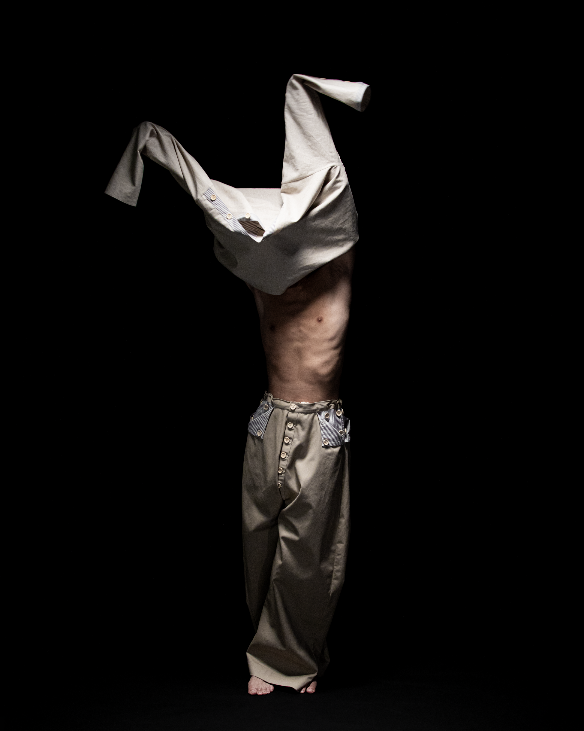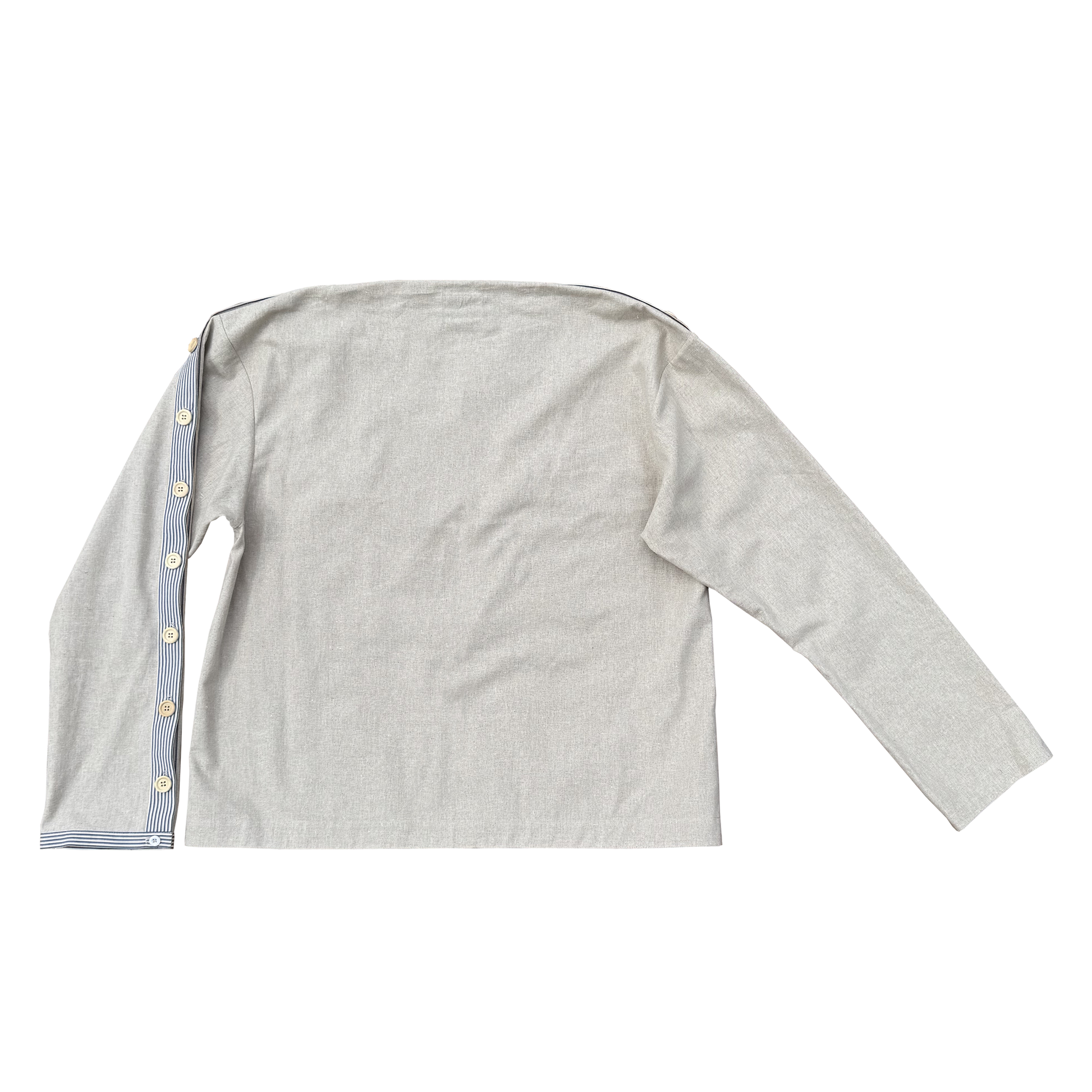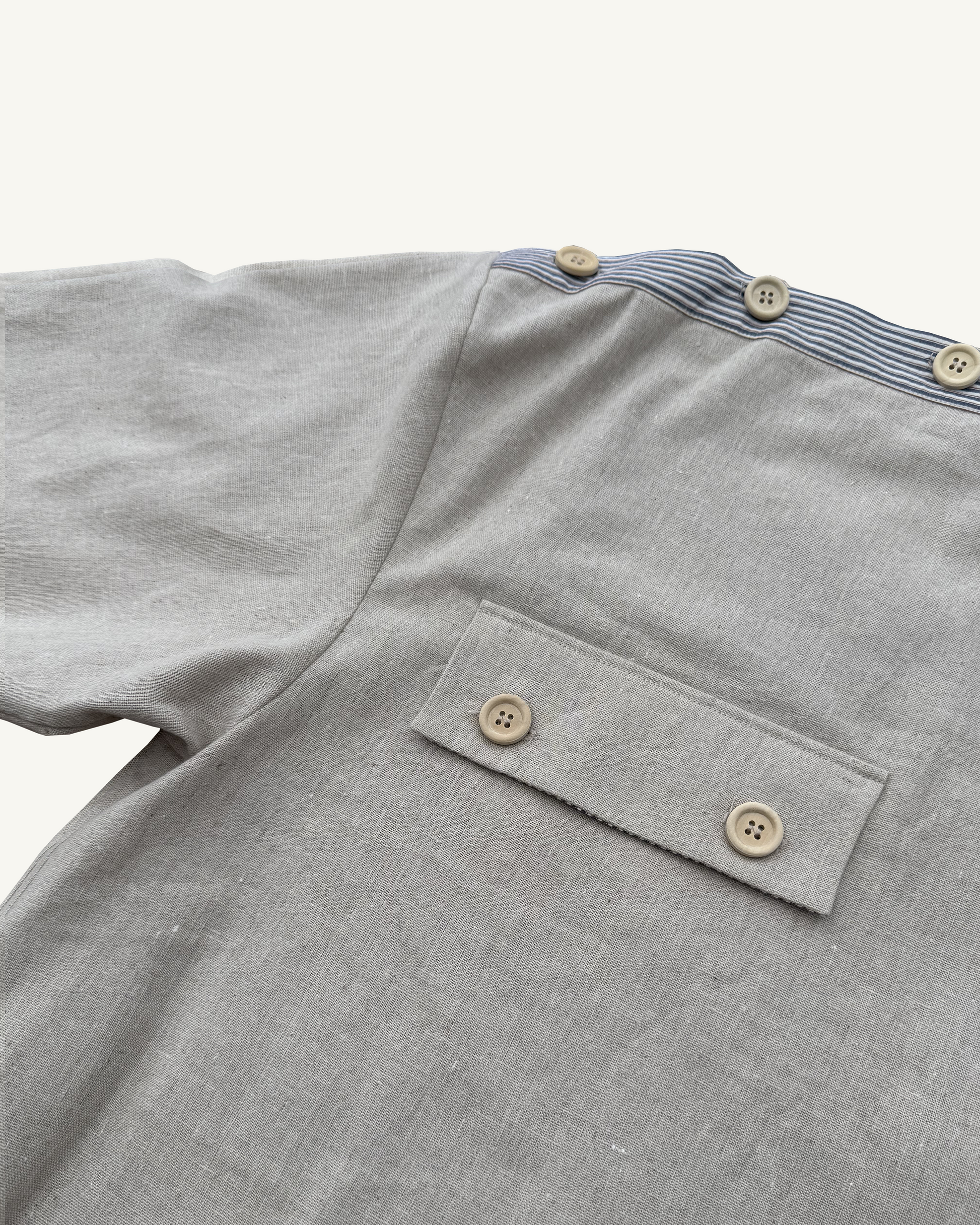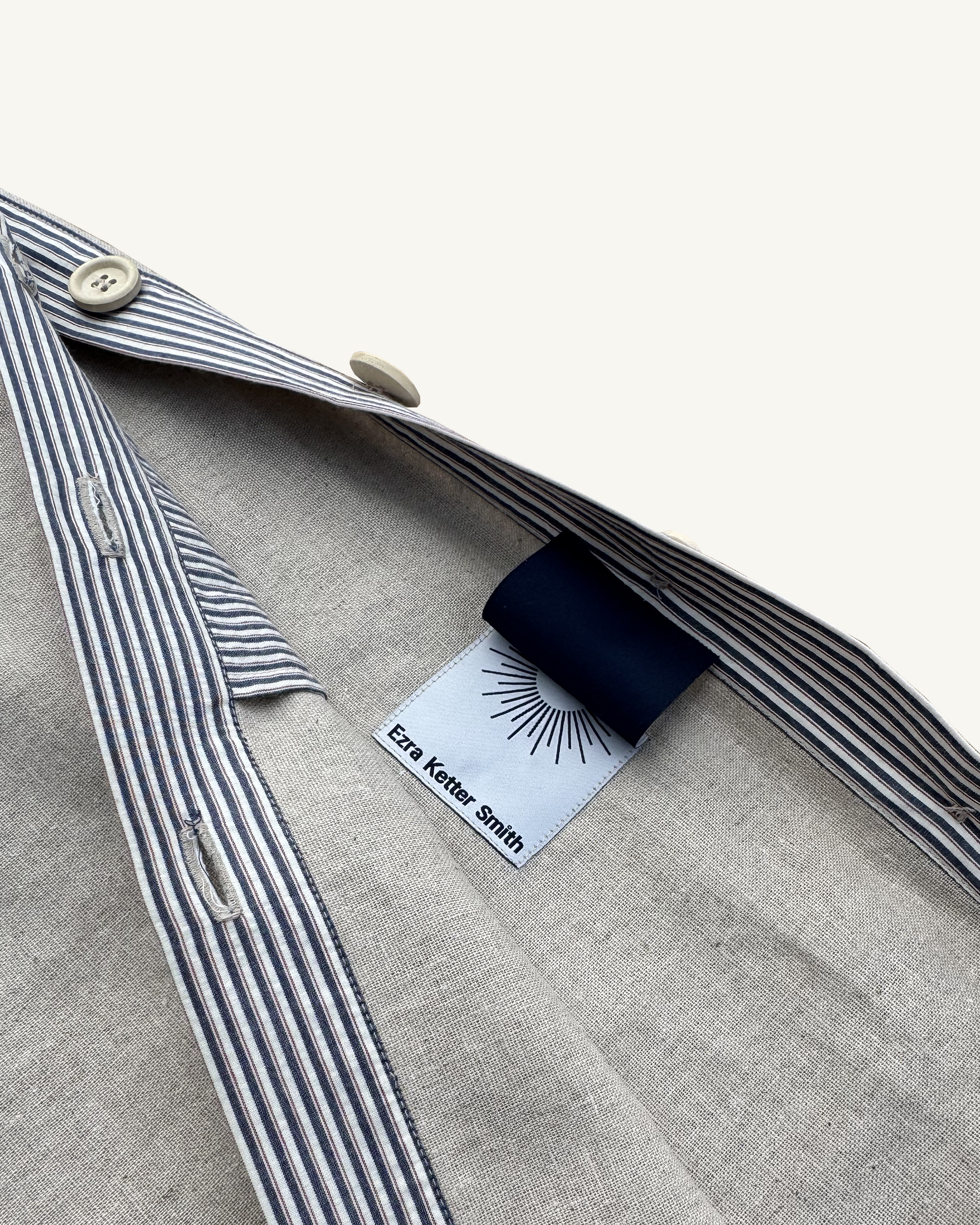 This resulted in a slouchier fit pullover with wider shoulders that almost looks “poncho-esque” when worn on body. This is primarily achieved through pattern adjustments to the sleeve intersection. As pictured, this piece was made with a “J” cut sleeve that mirrors the Dual Mule Trousers and provides ample room from the elbow up to the shoulder. The central design detail of this piece is an extended button placket that spans from one shoulder seam, across the neckline, down to the wrist of the opposing arm. This results in a unique look and an increased level of modularity at the arm and neck. The buttons can be snapped tight to create a more standard fit or undone to create a relaxed slash neck look. This piece also features a chest pocket with wood buttons that complement the collar. Fabric was meticulously chosen to most accurately reflect the natural look and feel of the rolling hills of the Badlands and the deep canyons of the West. A natural linen was utilized as the base, resembling the powdered ground that felt so many miles under my feet. and a cotton pinstripe seersucker was used as a contrast to resemble the many layers of sediment that left me in awe along my trip.